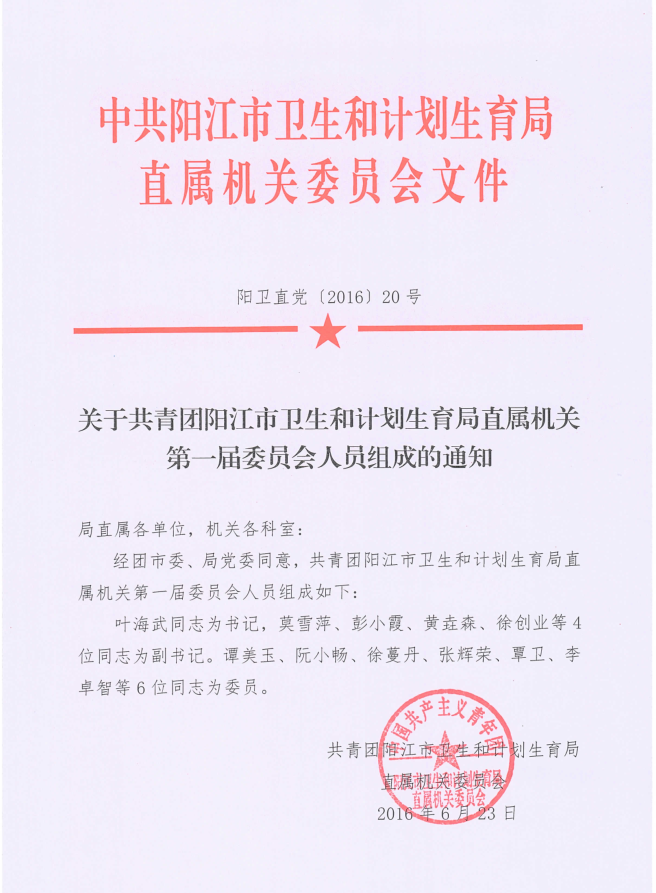 关于共青团阳江市卫生和计划生育局直属机关第一届委员会人员组成的通知
